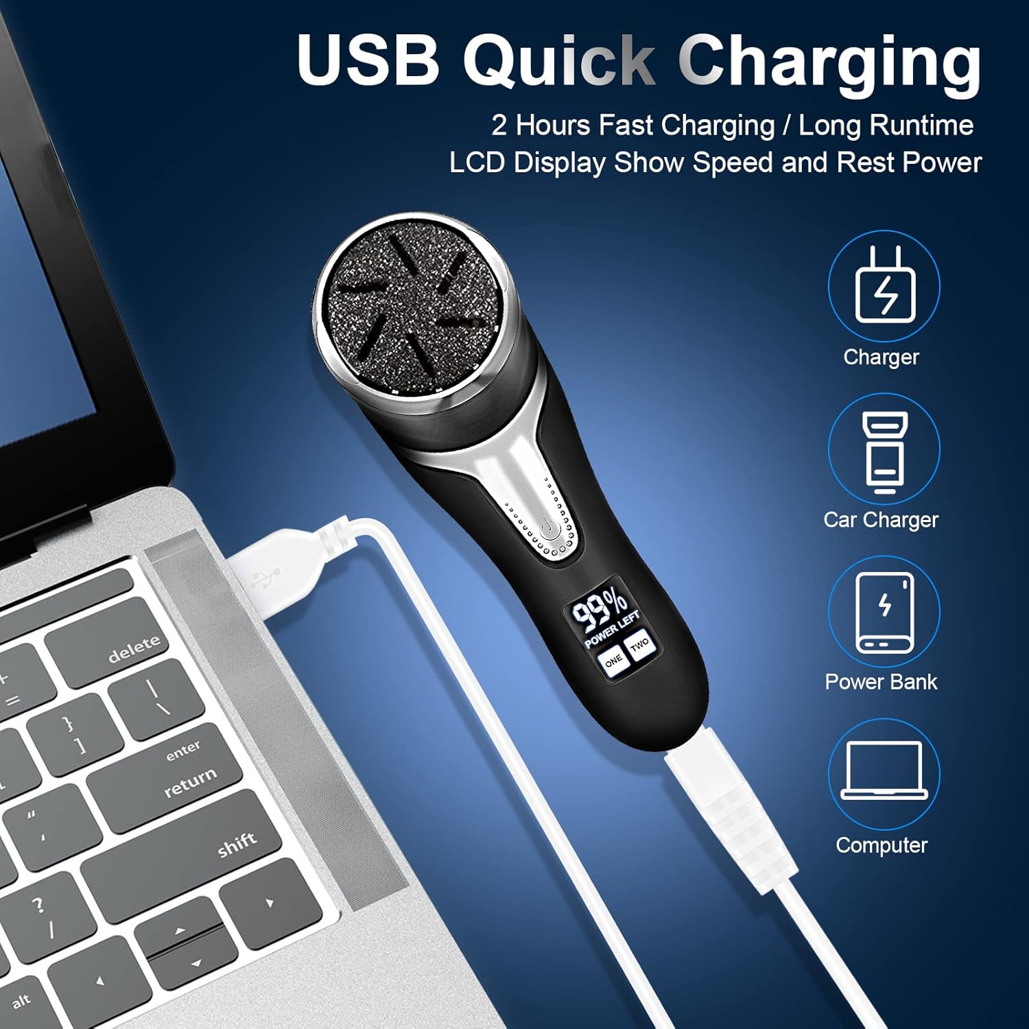 Rechargeable Electric Foot Callus Remover, LCD Display —– Foot file callus remover for feet only need 2hours usb charging and could get a 120min long runtime, including usb charging cable, this foot scrubber dead skin remover can easy charging with a laptop, power band, socket, and others; LCD Display show the speed and power status, let you how much battery left and remind you charge in time